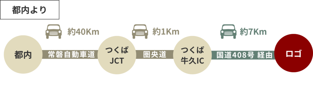常磐自動車道つくばJCT経由/圏央道 つくば牛久ICより国道408号線経由約20分
